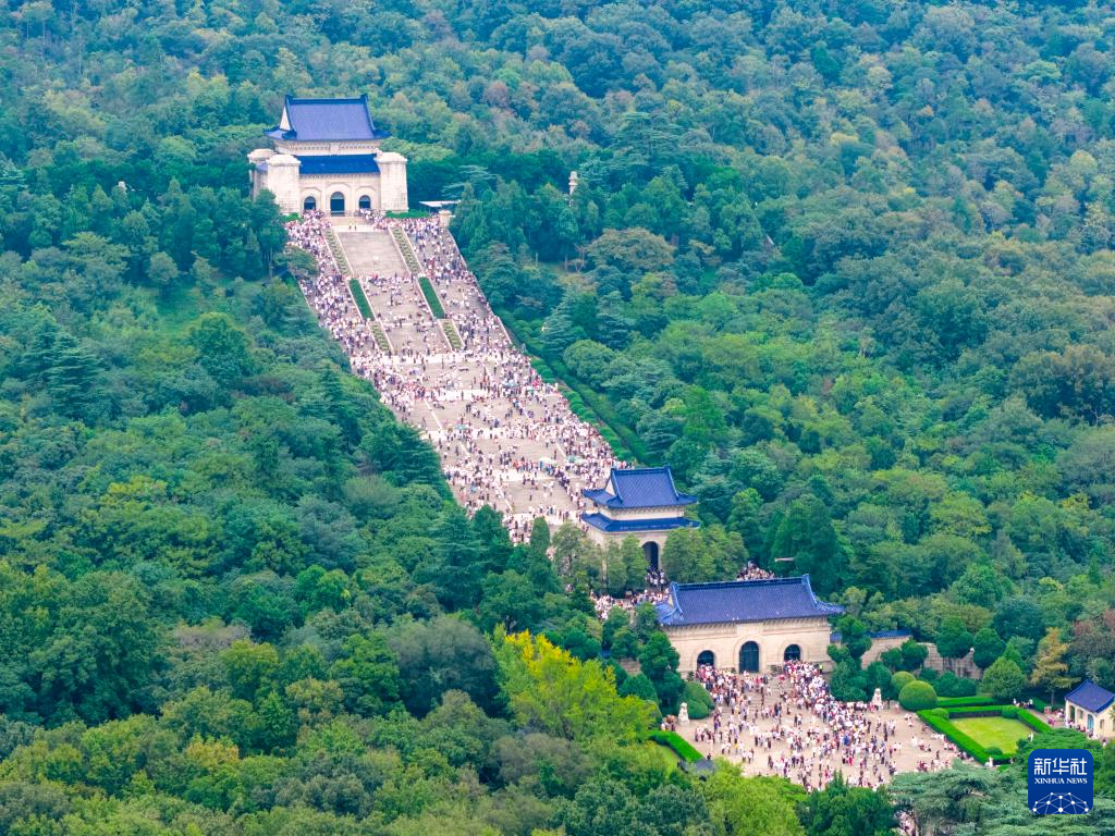 10月4日,游客在南京中山陵景区参观游览(无人机照片)。