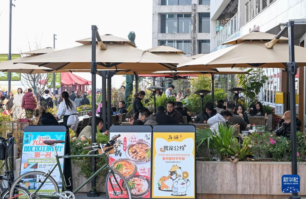 1月10日,消费者在上海市徐汇区西岸梦中心一家商铺外摆区域享用美食。