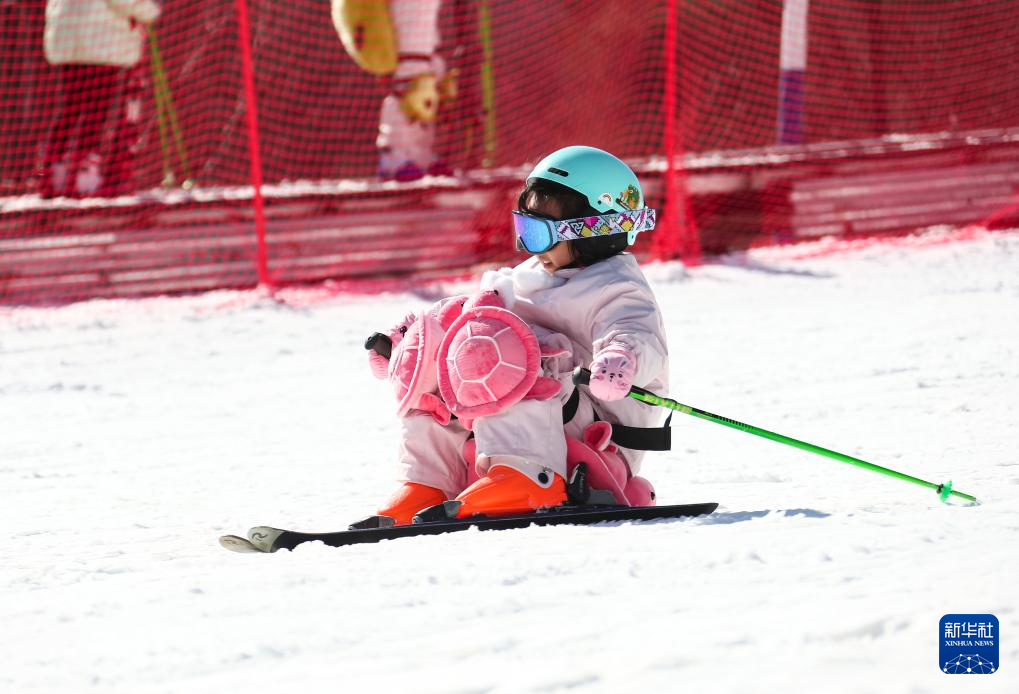 1月11日,小朋友在江苏省句容市宝华山滑雪场学习滑雪。