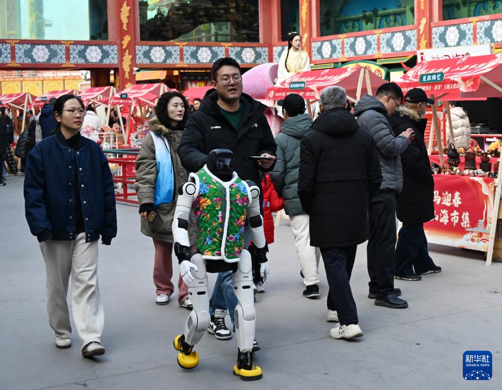 2月10日,在青岛市城阳区山海间不夜城主题街区,一台人形机器人在“逛”非遗大集。