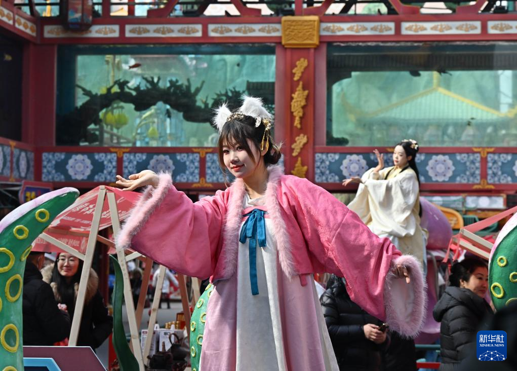 2月10日,在青岛市城阳区山海间不夜城主题街区,演员在活动现场表演。