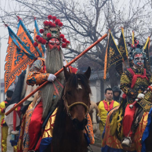 陇县古称陇州,是“中国社火文化之乡”,当地耍社火的历史可追溯至两千多年前。马社火以演员骑于马上而得名,是陇州社火最具代表性的形式之一。社火队由村民自发组成,每逢元宵节前,队员面绘脸谱,身穿戏服,骑于马上,于行进中演绎神话和历史故事,将新春祝福送至家家户户。