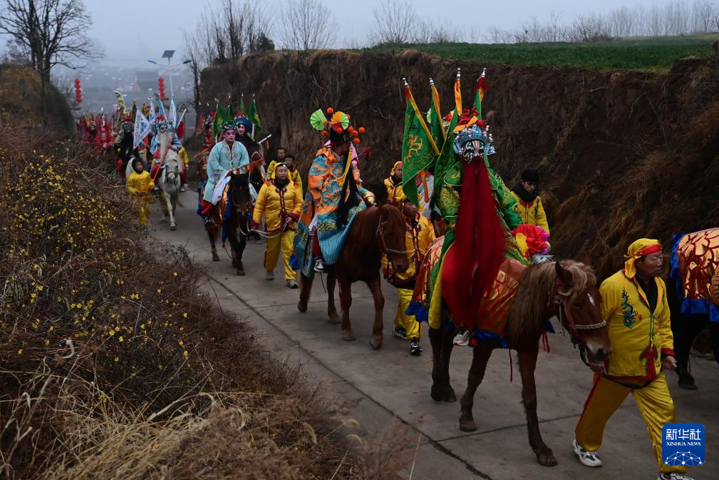 3月2日,人们在路边跟随陇县黄花峪村社火队游演。