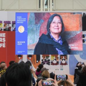 4月13日,在意大利博洛尼亚,2026年国际安徒生奖评委会主席谢琳·克雷迪在博洛尼亚国际童书展上宣布蔡皋获得2026年国际安徒生奖插画家奖。