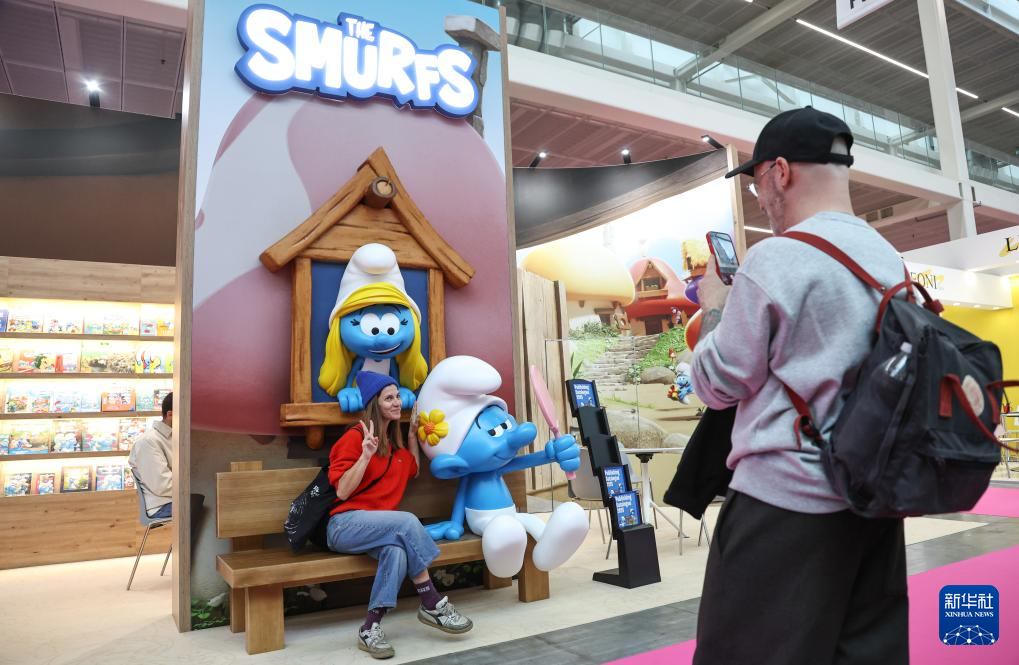 4月13日,在意大利博洛尼亚举行的博洛尼亚国际童书展上,观众与“蓝精灵”卡通形象合影。