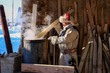 时下的阿勒泰,莽莽雪原银装素裹,最低气温仍低于零下二十摄氏度。在新疆阿勒泰市汗德尕特蒙古族乡汗德尕特村,非遗匠人铁木尔加甫·卡汗别力克挥斧刨木、鞣皮绑绳,一副副承载古老智慧的毛皮滑雪板在手中成型。