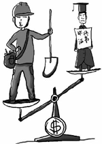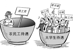 | 當前,盡管農民工在擇業上還遭遇歧視,大多數農民工從事著最苦、最累、最臟、最險及城市人最不愿意干的“五最”行業,但明顯的事實是,由于主張權益的新生代農民工的日益壯大,他們的權益保障已經受到了重視,而“農民工工資高出大學生”顯然與此有關,也與整整社會的環境有關。