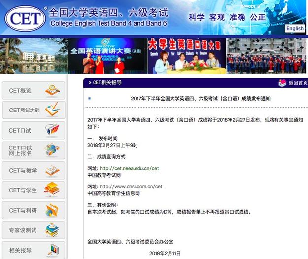 據(jù)全國大學英語四、六級考試委員會辦公室發(fā)布的通知,2017年下半年全國大學英語四、六級考試(含口語)成績今天發(fā)布!