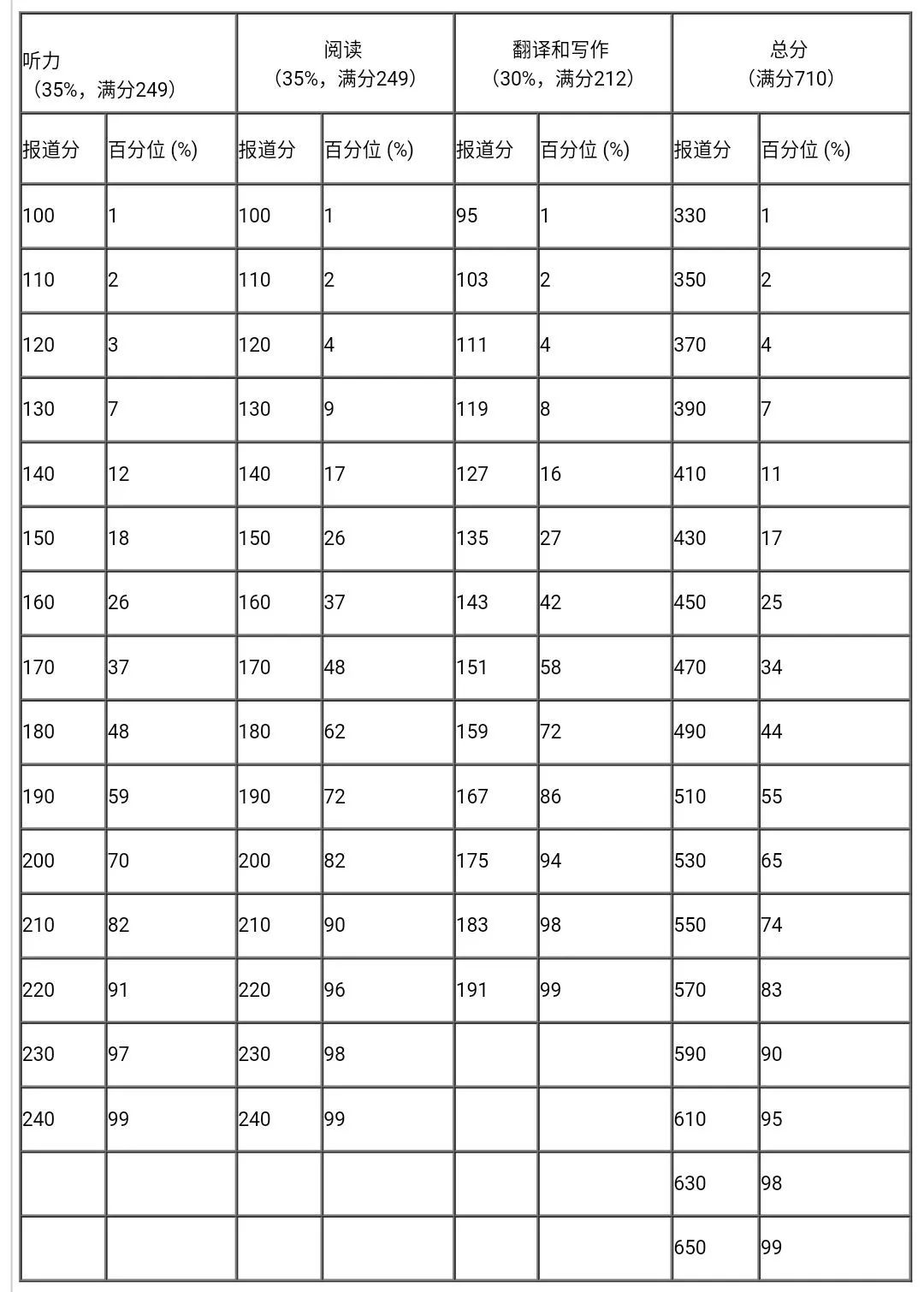 每次考試等值后的卷面分數(shù)都參照常模轉(zhuǎn)換為報道分。四、六級考試報道總分為710分,計算公式為: