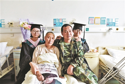5月27日下午,昆明醫科大學第一附屬醫院1號住院樓的神經外科,走進一群穿著學士服的女學生。她們是云南民族大學財務管理專業的畢業生,因為室友李夢楠的母親周玉梅重病住院,李夢楠可能無緣班級畢業照,室友們決定在病房里幫李夢楠完成拍攝畢業照的愿望。也是在這一天,李夢楠和家人拍下了第一張全家福。