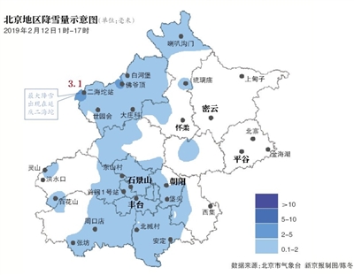監(jiān)測(cè)顯示,12日01時(shí)至16時(shí),北京全市平均降雪量0.5毫米,城區(qū)平均0.6毫米,最大降雪出現(xiàn)在延慶二海坨3.1毫米。