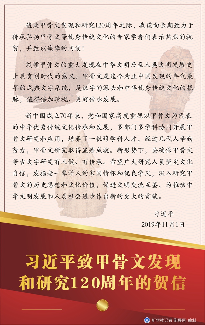 習近平致甲骨文發現和研究120周年的賀信 新華社記者 施鰻珂 編制
