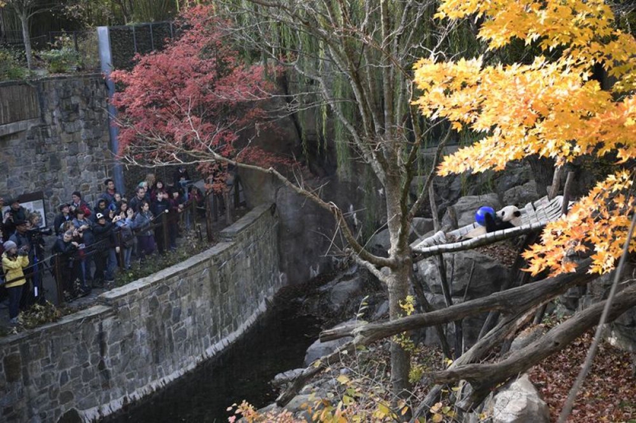 11月11日,在美國國家動物園,“貝貝”和游客見面。新華社記者劉杰攝