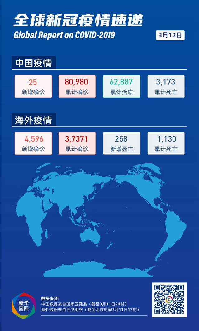 意大利全國(guó)范圍實(shí)施“封城”;法國(guó)、西班牙確診病例突破兩千;伊朗啟動(dòng)國(guó)家動(dòng)員計(jì)劃……世衛(wèi)組織報(bào)告顯示,截至北京時(shí)間11日17時(shí),中國(guó)以外有113個(gè)國(guó)家和地區(qū)報(bào)告確診病例37371例,死亡1130例。