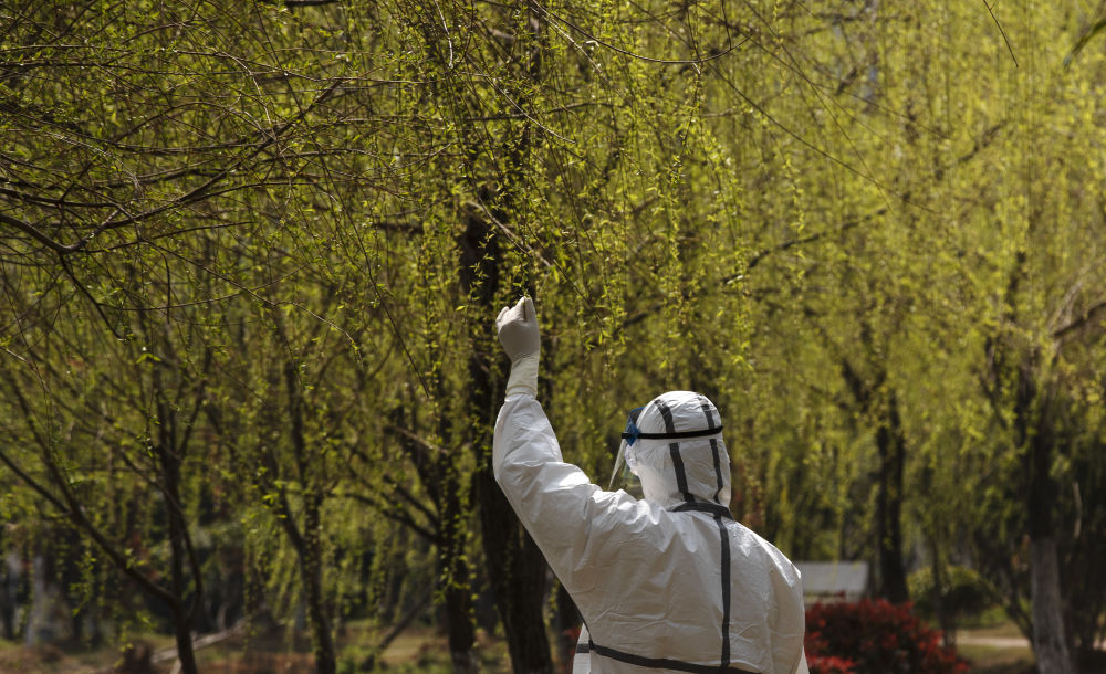 ↑3月14日,在華中科技大學(xué)同濟醫(yī)學(xué)院附屬同濟醫(yī)院光谷院區(qū),負(fù)責(zé)新冠病毒肺炎患者轉(zhuǎn)運的云南醫(yī)療隊隊員姚紅軍伸手觸摸剛剛發(fā)芽的柳枝。