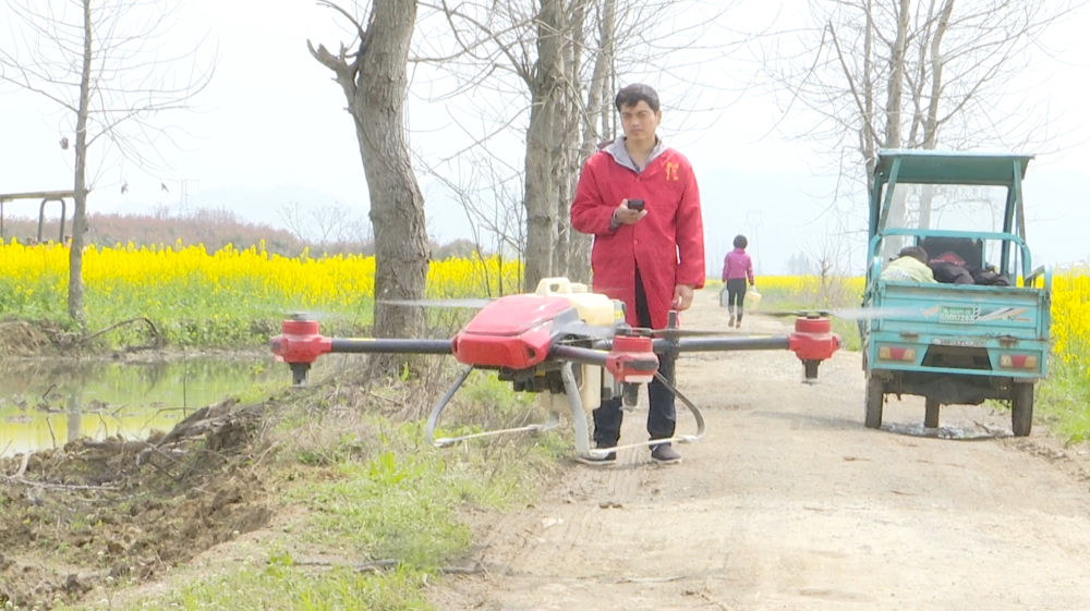 在柴桑區曹氏家庭農場,農場主曹敬民正熟練地操作植保無人機。曹敬民告訴記者,這次疫情對農場生產影響較小,通過政府信息化平臺和農技專家的幫扶支持,對今年農場增收充滿信心。