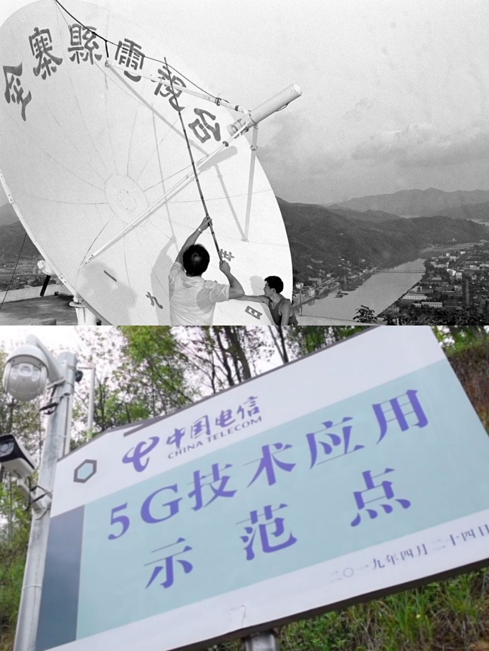 (上圖:1987年,金寨縣建成梅山地面衛(wèi)星接收站,新華社記者李錦攝;2019年,大灣村開通5G信號(hào)。新華社記者湯陽攝)