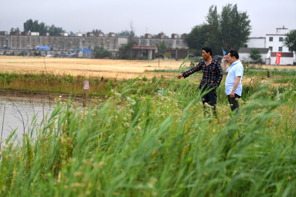 ↑?鄭加衛(右)在了解汪李村貧困戶的魚塘養殖情況。