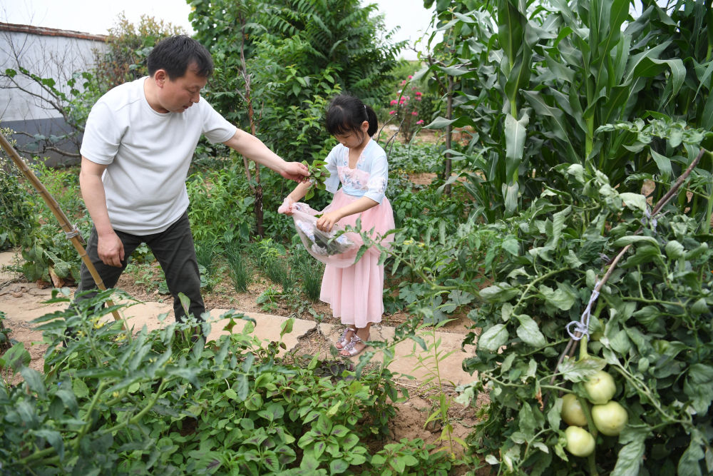 ↑?鄭加衛(左)在汪李村的一家瓜果種植基地里走訪。