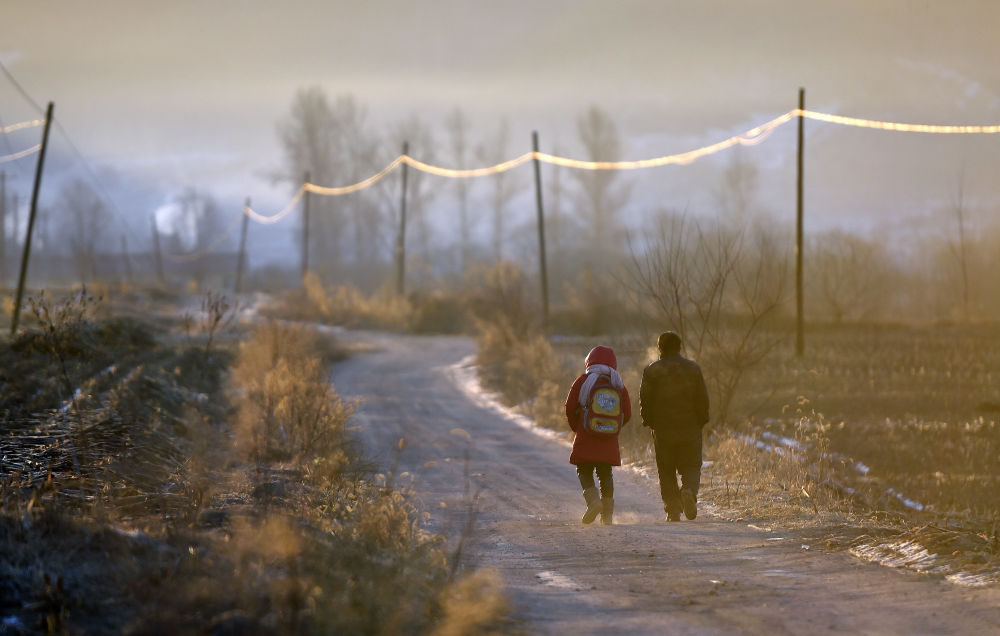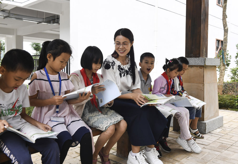 ↑廣西融水苗族自治縣的孩子手捧書本在校園合影