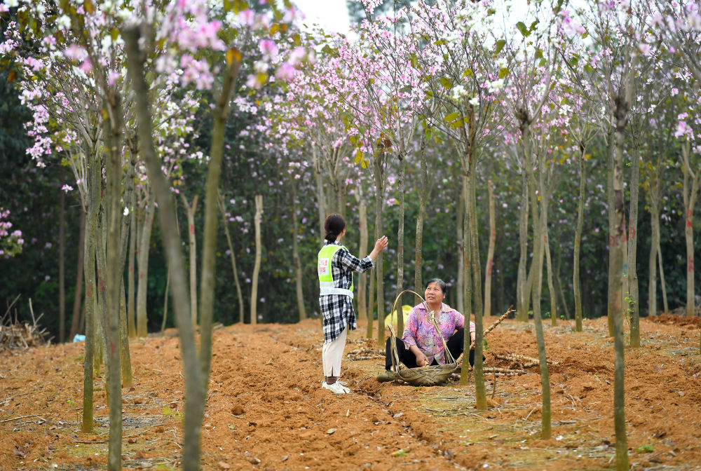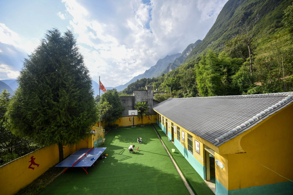 ↑重慶鐵路小學支教老師穆翼(左)和蓮花小學老師陶瑤一同打掃校園