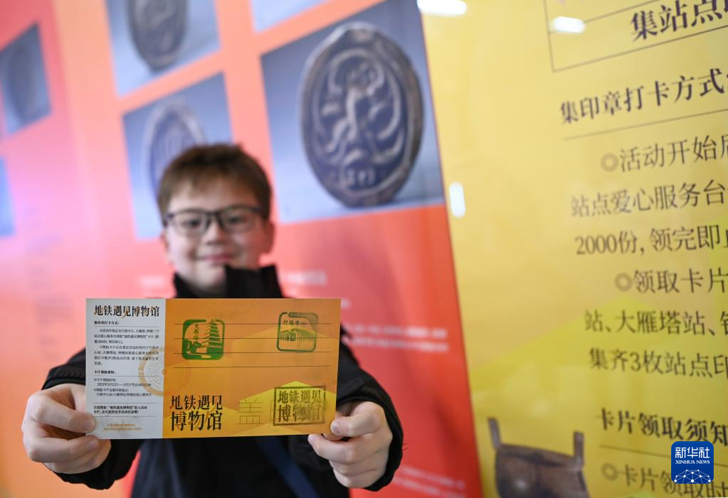 在西安地铁大雁塔站,一名小游客展示收集的印章(5月27日摄)。