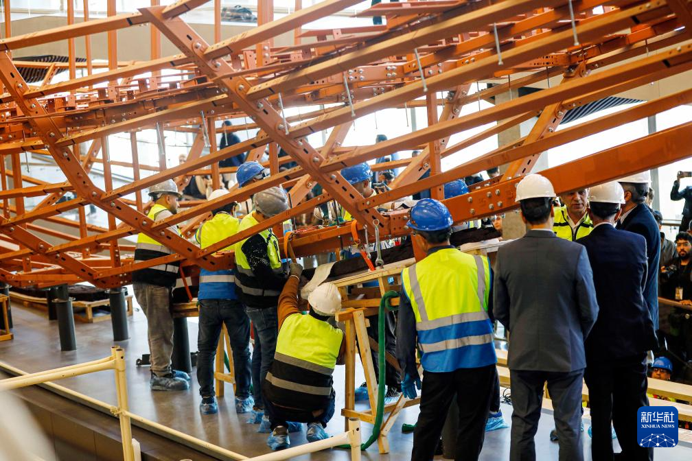 12月23日,在埃及吉萨的大埃及博物馆胡夫太阳船展厅内,埃及修复团队开展古埃及法老胡夫第二艘太阳船的组装工作。