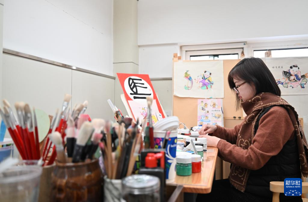 2月4日,在天津杨柳青画社,画师绘制年画《马到成功》。