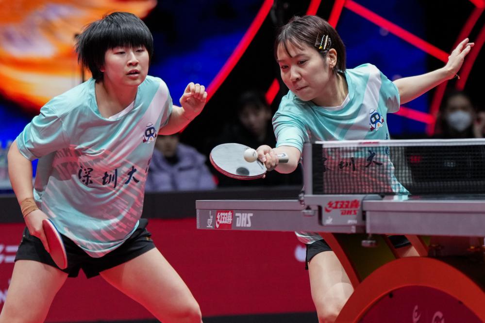 12月26日,深圳大学队组合覃予萱/平野美宇(右)在女双比赛中。新华社记者 李博 摄