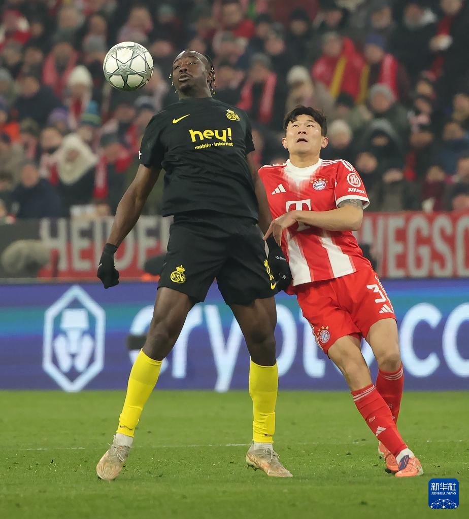 1月21日,拜仁慕尼黑队球员金玟哉(右)和圣吉罗斯联合队球员达维德在比赛中拼抢。
