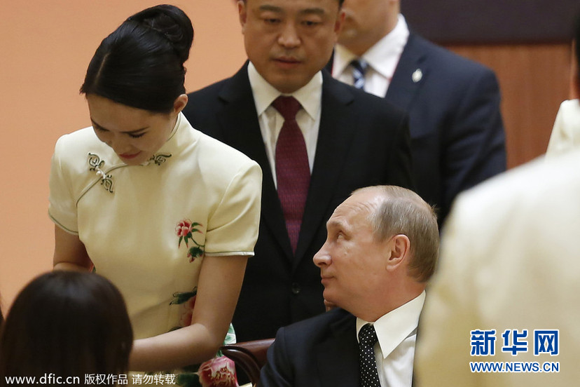 ??? 2014年5月20日,上海舉行亞洲相互協作與信任措施會議第四次峰會。俄羅斯總統弗拉迪米爾-普京出席2014上海亞信峰會歡迎晚宴,被美女禮儀服務小姐吸引。(圖片來源:東方IC)