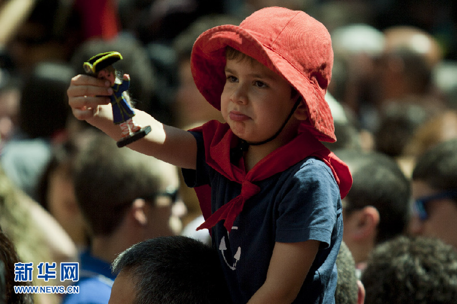 西班牙貝爾加(Berga)市的La Patum節上,手持玩具的小男孩。