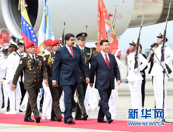 ????馬杜羅在機場為習(xí)近平舉行隆重歡迎儀式。兩國元首登上檢閱臺。軍樂團奏委中兩國國歌,升中國國旗。習(xí)近平在馬杜羅陪同下檢閱儀仗隊。