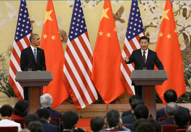 圖為11月12日,國家主席習近平在北京人民大會堂與來訪的美國總統奧巴馬舉行會談后,共同會見記者。