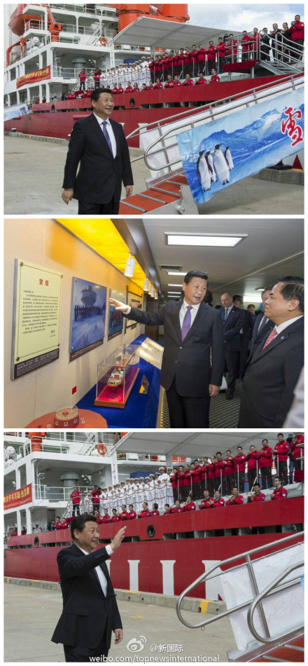 ??? 習近平攀舷梯,進船艙,參觀了極地考察30周年圖片展。在今年建成的南極泰山站模型前,他連著問:“站里多少人?”“現在南極是白天?”“能看電視嗎?”