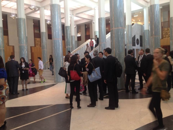 ????這次在澳大利亞,“掌聲響起來”的地方,是堪培拉的標志性建筑——澳聯邦參眾兩院所在議會大廈的眾議院會議廳。演講的聽眾?自然主要是議員先生和女士們啦,還有陪同出席演講的阿博特總理、帕里參議長、工黨領袖肖滕,以及主持人畢曉普眾議長。