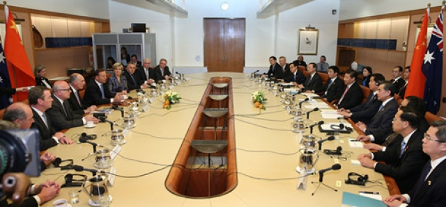 ????【畫外音】這些協(xié)議涉及貿易、投資、能源礦產、農牧業(yè)、基礎設施建設、金融、教育、新能源、海洋極地、氣候變化、旅游等領域,最值得一提的是兩國政府關于實質性結束中澳自由貿易協(xié)定談判的意向聲明,其他一些協(xié)議的“含金量”也非常高,如加強投資合作的框架協(xié)議等,一些協(xié)議則事關全球性問題,如氣候變化合作諒解備忘錄,還有一些協(xié)議則更加“接地氣”,比如相互承認高等教育學歷和學位的協(xié)議、中澳企業(yè)間農業(yè)與食品安全百年合作計劃等。