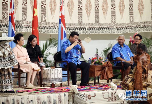 ???? ?11月21日,國家主席習近平在楠迪出席斐濟總理姆拜尼馬拉馬舉行的傳統歡迎儀式。這是在歡迎儀式上,斐濟原住民向習近平敬獻洋格納樹根制成的卡瓦汁,習近平慢飲而盡。新華社記者 姚大偉 攝