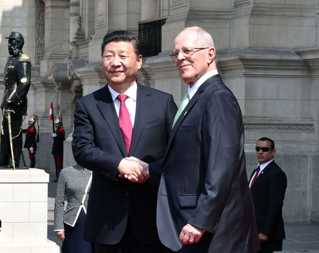 11月21日,國家主席習近平在利馬同秘魯總統庫琴斯基舉行會談。會談前,習近平出席庫琴斯基在總統府前廣場舉行的歡迎儀式。(新華社記者 李濤 攝)