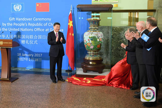1月18日,國(guó)家主席習(xí)近平在瑞士日內(nèi)瓦萬(wàn)國(guó)宮出席“共商共筑人類命運(yùn)共同體”高級(jí)別會(huì)議,并發(fā)表題為《共同構(gòu)建人類命運(yùn)共同體》的主旨演講。這是會(huì)議結(jié)束后,習(xí)近平出席中國(guó)向聯(lián)合國(guó)日內(nèi)瓦總部贈(zèng)禮儀式。(新華社記者張鐸攝)