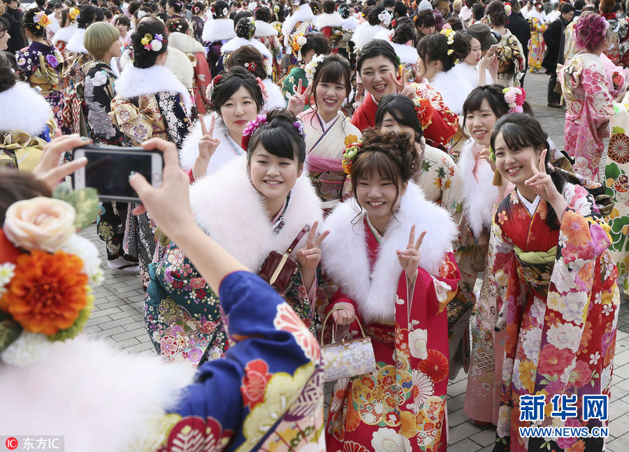 日本和服妹子出席“成人節”慶祝儀式 開心玩自拍