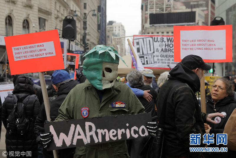 4月15日,美國紐約,民眾舉行反戰(zhàn)游行,抗議美英法聯(lián)軍襲擊敘利亞。(圖片來源:視覺中國)
