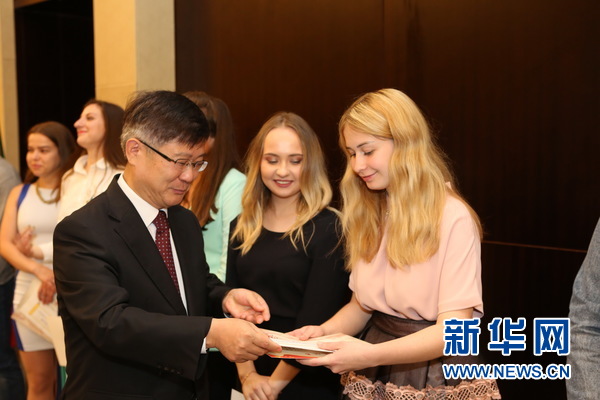 中國(guó)駐白俄羅斯大使崔啟明向白俄羅斯學(xué)生頒發(fā)獎(jiǎng)學(xué)金。新華網(wǎng)記者 魏忠杰攝