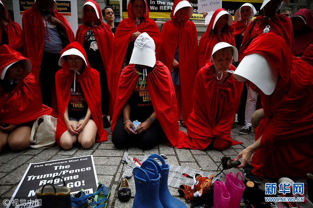 當地時間2018年7月31日,美國紐約,女性示威者扮成美劇《使女的故事》中的“使女”在亞歷山大·漢密爾頓海關大樓前示威,抗議美國總統特朗普和副總統麥克·彭斯。她們手持鞋子,代表被迫與父母分離的移民兒童。(圖片來源:視覺中國)