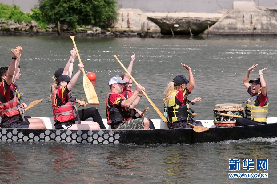 6月22日,由芝加哥華商會(huì)舉辦的第19屆芝加哥龍舟賽在中國城譚繼平公園舉行,這是參賽的隊(duì)員在比賽。記者 汪平 攝