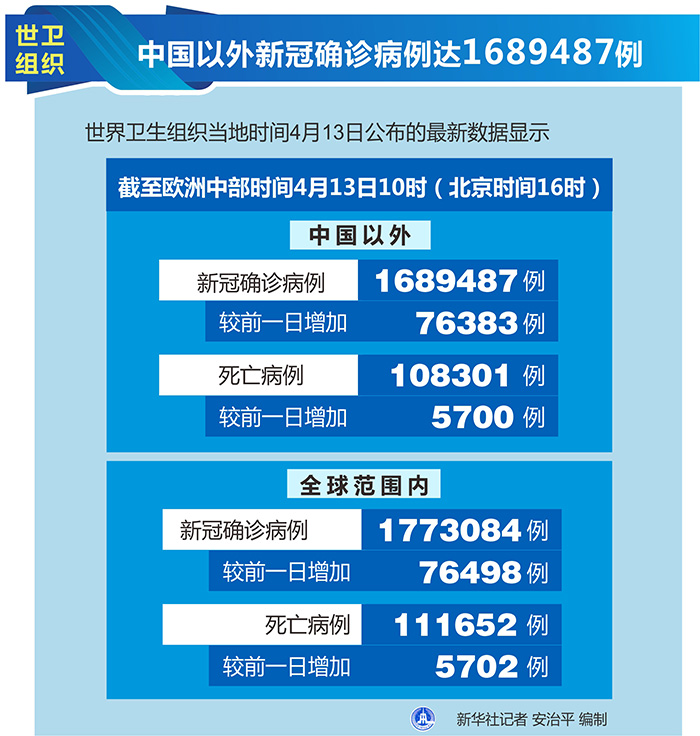 新華社日內(nèi)瓦4月13日電(記者劉曲)世界衛(wèi)生組織13日公布的最新數(shù)據(jù)顯示,中國以外新冠確診病例達到1689487例。